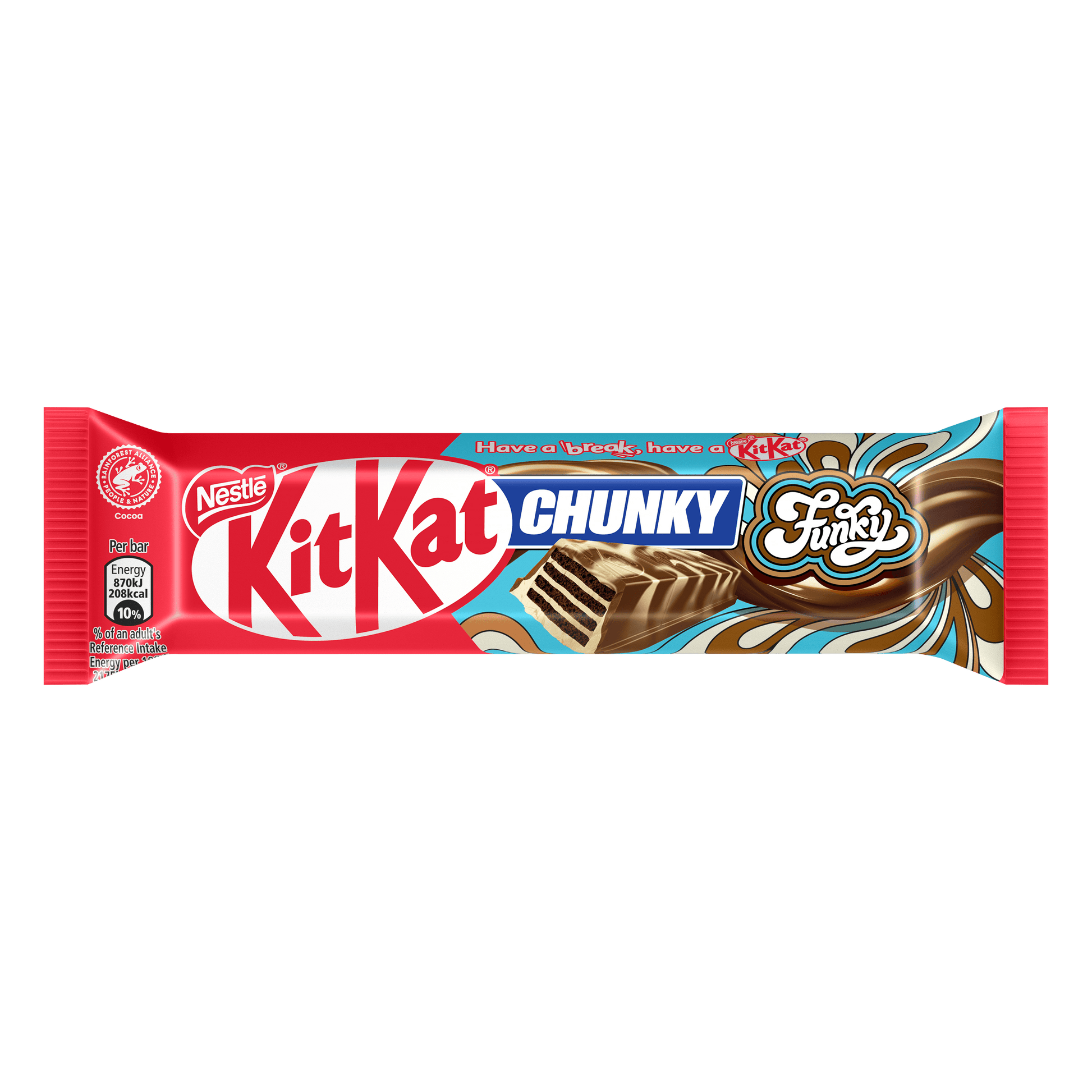 Découvrez la nouvelle barre KitKat® Chunky Funky : une gaufrette croustillante au cacao, enrobée d’un généreux chocolat au lait onctueux et sublimée par une touche de chocolat blanc.